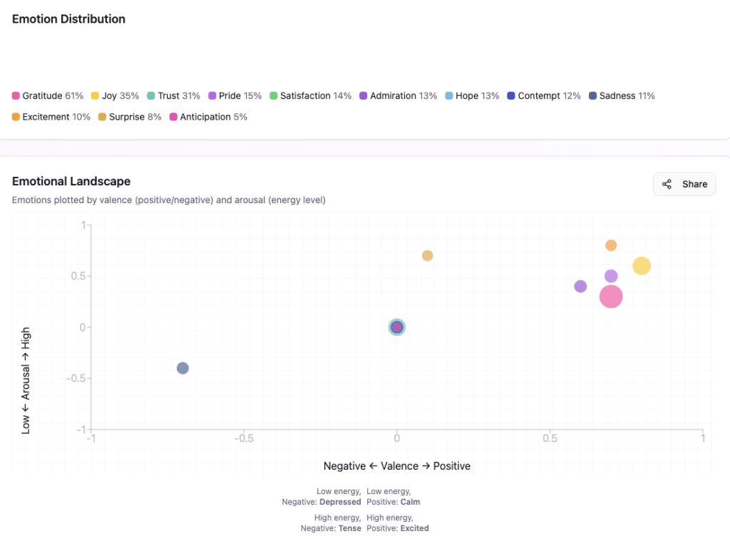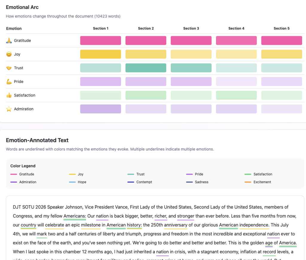 What the emotigraphic profile does not foreground is equally revealing. Contempt registers at only 12% and sadness at 11%, despite the speech containing multiple graphic victim narratives (Lizbeth Medina stabbed 25 times, Iryna slashed on the train, Sarah Beckstrom shot in the head) and sustained Democratic shaming sequences. This suppression of negative emotion probability relative to what a surface reading might predict suggests that the speech’s rhetorical architecture successfully contains its dark passages within a larger positive frame — the victims are honored, the villains are being defeated, and the grief is converted into gratitude for the heroes responding to it. The model’s 5-section emotional arc would likely show gratitude and joy dominating sections 1-2 (economic wins, hockey team) and sections 4-5 (military honors, peroration), with contempt and sadness peaking briefly in section 3 (immigration victims, Democratic shaming) before being re-absorbed into the triumphant register that closes the speech. In totality, the emotigraphic signature is that of a speaker — and a speech — performing confident, validated authority rather than fighting for it.